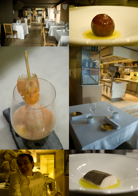 Marcelo Tejedor met la nappe, disais-je… En quelques minutes, une barquette en polystyrène déboule là, sans couverts. « Moïto dé rrroubarbe ». Pardon ? On croque dans un parallélépipède légèrement rosé et transparent nappé de sucre, acide mais pas tant, imbibé de jus. C’est glacé, alcoolisé et l’on décrypte aussitôt : « Mojito de rhubarbe ». L’estomac est nettoyé avant la soupe de cèpes. Puis une St Jacques, quelques algues dont Marcelo fait couramment l’usage et un trait de balsamique qui donne un vrai coup de fouet. J’oubliais… : la truffe râpée généreusement. Et hop, nous voilà à terre ! Suit, la « pomme de terre poireau ». Une espèce de croquette de forme de tronçon de poireau, effeuillée, croustillante et molle parmentier à cœur ! Bluffés los frences.