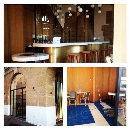 Le Poulpe de Michel Portos prend forme! Derniers jours avant ouverture… Carreaux grande bleue, bar en or, tables art déco, un petit air de l’Homme Bleu, face mer. Très beau!